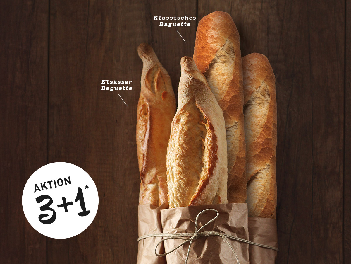 Ob für das Picknick im Park, das Sommerfest oder die Grillparty: Unsere Baguettes dürfen hier einfach nicht fehlen. Mach mit bei unserer knusprigen Sommer-Aktion 3+1 und bekomme beim Kauf von drei Baguette-Stangen eine gratis dazu. Unser Angebot gilt für die klassischen Baguettes und das rustikale Elsässer Baguette.