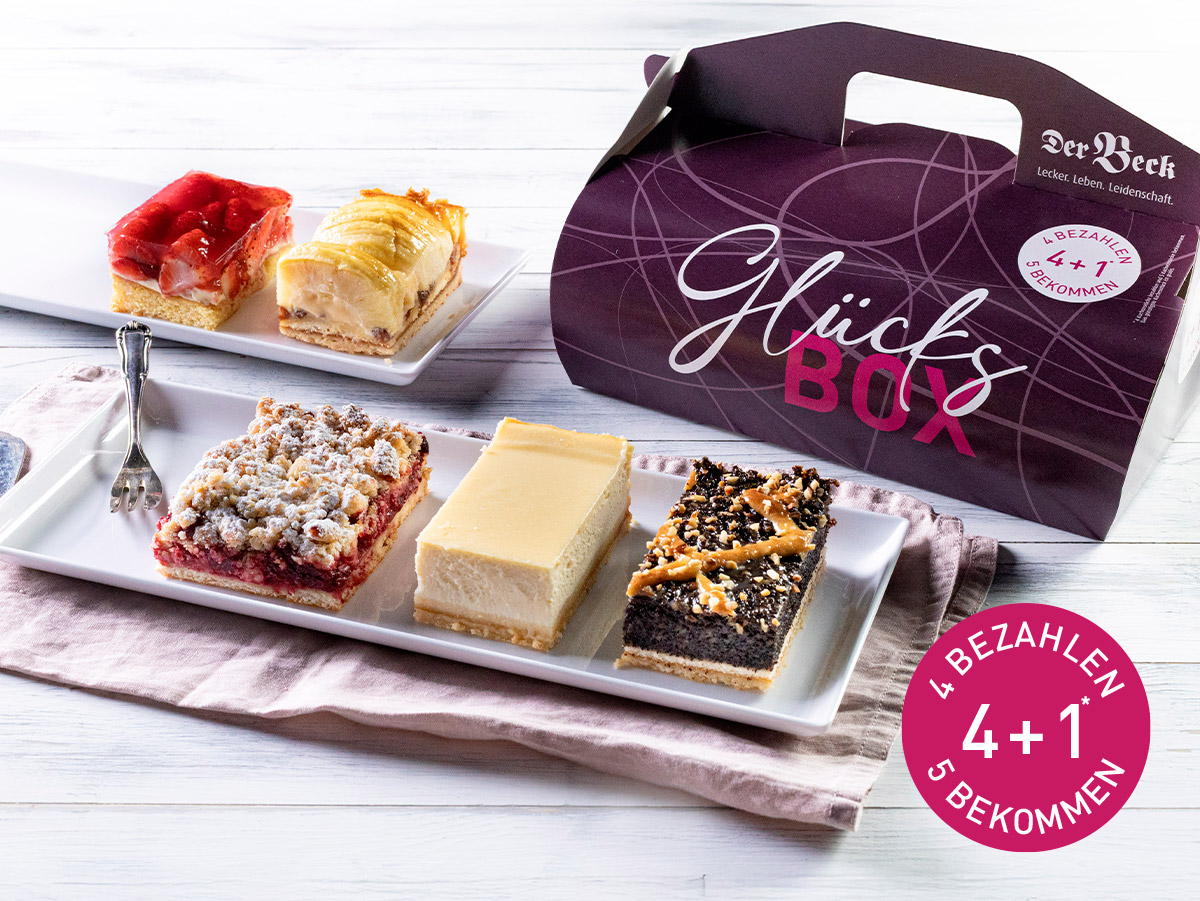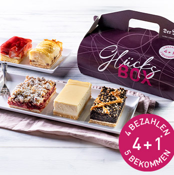 Hol dir deine Kuchen-Glücksbox! Bei unserer Kuchenaktion 4 + 1 bekommst du 5 Stücke, zahlst aber nur 4 – das günstigste Stück schenken wir dir! Perfekt, um dir selbst etwas Gutes zu tun und gemeinsam mit deinen Lieblingsmenschen zu genießen.