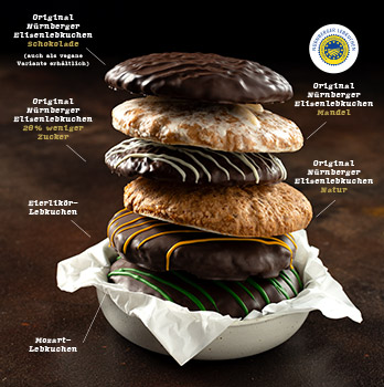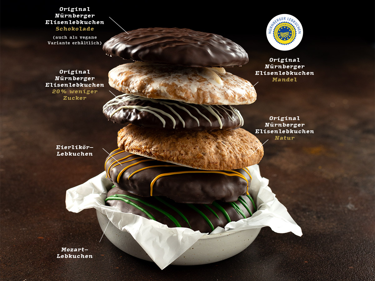 Unsere große Auswahl an Lebkuchen macht rundum glücklich und lässt keine Wünsche offen. Neben unseren Original Nürnberger Elisenlebkuchen in den Sorten Mandel, Natur & Schokolade gibt es zwei köstliche Exoten auf dem Weihnachtsteller. Lasst euch verführen vom Mozart-Lebkuchen mit Marzipan und Nougat oder unserem Lebkuchen mit Eierlikör-Füllung.