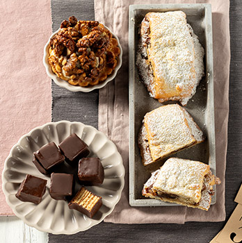 Ob unsere Walnusskracher mit karamellisierten Walnüssen, die saftigen Bobbes aus leckerem Mürbeteig oder unser Baumkuchenkonfekt in feinster Schichtarbeit, umhüllt mit Zartbitterschokolade – dieses Weihnachts-Trio hätten wahrscheinlich schon die Heiligen Drei Könige gerne in ihrem Geschenkkorb gehabt.