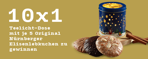 Gleich doppelte Freude erwartet die Gewinner unserer besonderen Lebkuchendosen, die gefüllt sind mit 5 feinen Original Nürnberger Elisenlebkuchen der Sorten Natur, Mandel und Schoko. Ist der Inhalt erst vernascht, zaubert die Dose zusammen mit einem Teelicht Adventsstimmung in euer Zuhause.